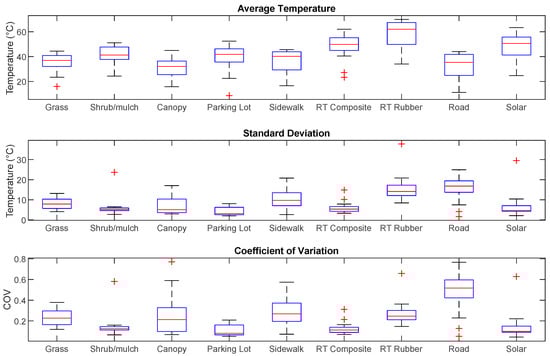 The distribution of the average temperature, standard deviation and coefficient of variation for the fourteen Milwaukee, WI flights is further illustrated in Figure 4. The shrub/mulch, composite rooftop and solar panels have the most consistent variability among the land use types as shown in the boxplot distribution of their coefficient of variation, while the greatest spread in variation occurred in the road and sidewalk. This may indicate that areas that are not subject to human traffic (e.g., shrub/mulch flower beds, rooftops and solar panels) have more consistent variability in their temperatures, while other areas that are subject to intermittent human traffic (e.g., roads and sidewalks) have inconsistent temperature variabilities. We also evaluated if the variability in land surface temperature correlated with any meteorological parameters but found no statistically significant predictors.