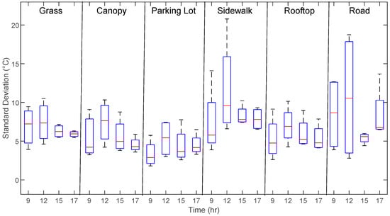 We evaluated the variation in surface temperatures throughout the day and found that the highest degree of variation occurred at noon. This is demonstrated in the Figure 5, which shows box plots of the standard deviation for six land use types: grass, canopy, parking lot, sidewalk, composite roof and road for data from both MU and UTEP. As illustrated, all land use types have the greatest standard deviation in temperatures during 12:00 PM, with lower levels of deviation in the morning and late afternoon. This trend suggests that as surfaces heat up, they do so at different rates, which contributes to more variability during mid-day.