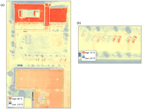 Spatial distribution of temperature from a flight recorded on 11 July 2018 (a) and zoomed in spatial distribution of temperature for the concrete parking lot from a flight recorded on 11 July 2018 (b). The hotter surfaces (red) in the right image are parked cars and the cooler surfaces (blue) are heat shadows visible after parked cars leave.