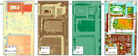 Spatial distribution of tempearture (a), albedo (b), NDVI (c) and ATI (d) for a flight recorded on 11 August 2018.