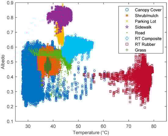 To further explore this variability and assess its impact on surface temperatures, we plotted these surface properties against land surface temperature. Figure 8 illustrates temperature plotted against its respective albedo for the 611,460 total data points captured by the drone imagery and results show clusters that form for different surface types. Some of these clusters exhibit either a (1) low range in albedo and high range in temperature or (2) high range in albedo and low range in temperature. For example, the road exhibits a low range in albedo and high range in temperature, implying the variability in roadway temperatures are more dependent on meteorological (e.g., exposure to solar radiation) and human (e.g., traffic) variables than physical properties (e.g., albedo). On the other hand, the parking lot has a higher but similar range in albedo, yet it has a much lower variability in temperature. This could be due to the fact that the parking lot has a range of materials from asphalt to concrete coupled with a much lower level of traffic as compared to the roadway, which is more homogenous and experiences constant vehicular traffic that intercepts land surface exposure to solar radiation. Therefore, this graphic may support the previous statement that there are anthropogenic variables, such as intermittent human foot or vehicular traffic, that are significant to land surface temperature processes. Overall these results suggest that patterns in the physical properties of urban materials may provide insight into surface temperature variability.