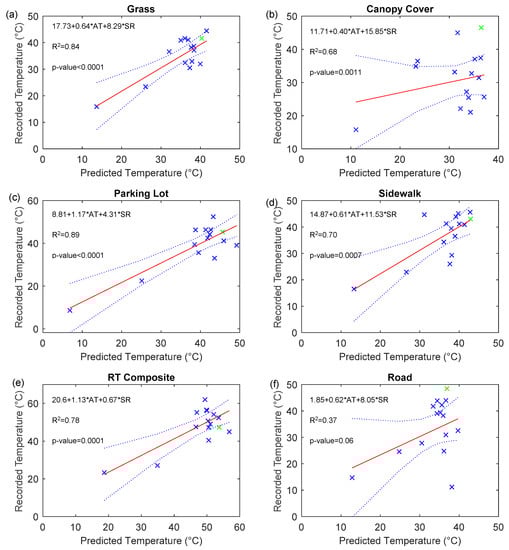 Temperature prediction models of six surface types: grass (a), canopy cover (b), parking lot (c), sidewalk (d), composite rooftop (e) and road (f). UTEP datapoint is fitted in green. Note the 95% confidence intervals are in blue.