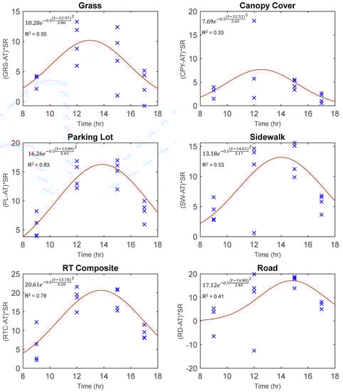 Finally, we explored the variation in surface temperatures as they change throughout the day (9 AM, 12 PM, 3 PM and 5 PM) and evaluated if this variation could be explained by any meteorological parameters. In addition to exploring diurnal changes in variability, we applied the data to develop a model to predict land surface temperatures throughout the day for the six land use types common to each location. To do so, we applied the drone data collected on the four diurnal flight missions to estimate land surface temperatures based upon the solar radiation and the difference between the air and land surface temperatures, which have been found to be statistically significant predictors for diurnal estimates of pavement temperatures [39].
