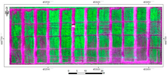 An UAV sensor platform, DJI S1000 UAV (SZ DJI Technology Co., Ltd., Sham Chun, China) with eight propellers, which is very stable at low flight speed and low altitude, was used in Trail 3 in this study. The UHD 185 Firefly (UHD 185 firefly, Cubert GmbH, Ulm, Baden-Württemberg, Germany) is a snapshot hyperspectral sensor. The UHD 185 has a short exposure and integration time, weighs 0.47 kg, and measures 195 × 67 × 60 mm3. Its operating range spans from the visible to the near-infrared (wavelength range: 450 nm to 950 nm, 8 nm @ 532 nm). Hyperspectral data cubes were automatically resampled to 4 nm spacing. Collected radiation is recorded as a 1000 × 1000 (1 band) panchromatic image and a 50 × 50 (125 bands) hyperspectral cube. The fusion steps are implemented in Cubert Cube-Pilot software (Cube-Pilot, Version 1.4, Cubert GmbH, Ulm, Baden-Württemberg, Germany). After fusion, all hyperspectral images with 1000 × 1000 (125 bands) were stitched together using an image stitching process, and the final result is shown in Figure 2.