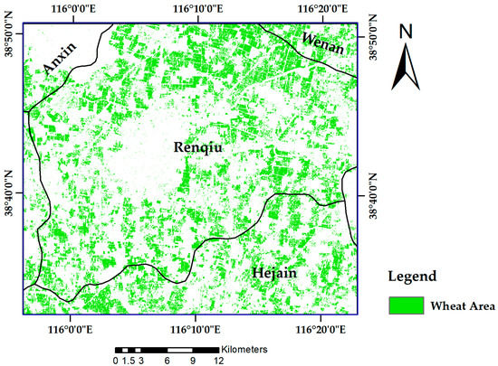A supervised classification method of maximum likelihood combined with decision tree classification was used to complete the extraction of the winter wheat planting area. The wheat extraction results are shown in Figure 3.