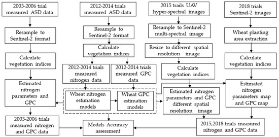 This paper aims to investigate the feasibility of using VIs derived from Sentinel-2A/2B (with an emphasis on the red-edge band) to detect the wheat N status and, furthermore, to quantitatively forecast the wheat grain protein of crops before they fully ripen. First, we simulated the Sentinel-2A/2B multispectral data from wheat canopy hyperspectral data for wheat nitrogen and GPC monitoring. Then, the relationship between different spectral parameters and wheat nitrogen index and wheat grain protein content was analyzed. The wheat nitrogen estimation models and GPC estimation model were then established based on the selected wheat nitrogen-sensitive spectral VIs. The estimation accuracy for the models was verified by simulated Sentinel-2 data obtained from UAV-UHD image in Trail 3 and ASD spectral data in the 2003–2006 experiment in Beijing. Next, the models were applied in the Renqiu area and verified by the real Sentinel-2A data and the ground measured data. Figure 4 shows the workflow of the study.