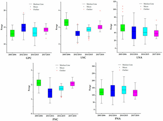 We obtained the measured data of LNC, LNA, PNC, PNA, and GPC for a total of seven trials in three experimental regions. The 2012–2014 experiments in the National Experimental Station for Precision Agriculture in Beijing obtained 80 sets of measured data for calculation, the 2003–2006 winter wheat experiments in the suburbs of Beijing obtained 63 sets of measured data for verification, and the 2017–2018 experiment in the Renqiu area obtained 20 sets of data for verification. The distribution of the experimental data between the three geographical spans was analyzed using a box plot (Figure 5).