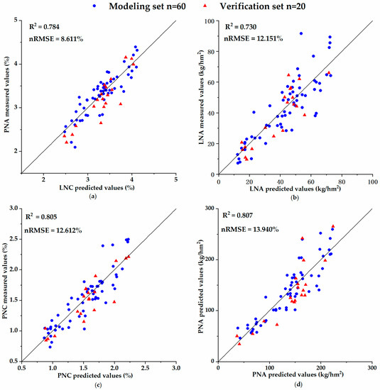 Figure 7 Shows that for the four nitrogen nutrition parameters inversed by the vegetation indices, the maximum of the nd the minimum was for LNA (0.730). Modeling accuracy of all four models reached a very significant level. Therefore, the four nitrogen nutrition parameters could be inverted by the vegetation indices and the models can predict the nitrogen nutrition parameters well. To verify the indicator nRMSE based on the verification set, the minimum LNC is 8.611%, which is not significantly different. The nRMSE of LNA, PNC, and PNA were 12.151%, 12.612%, and 13.940%, respectively. Considering the accuracy verification indicators of each modeling set and verification set, PNA has a higher modeling accuracy and a smaller nRMSE and so the model is more stable.