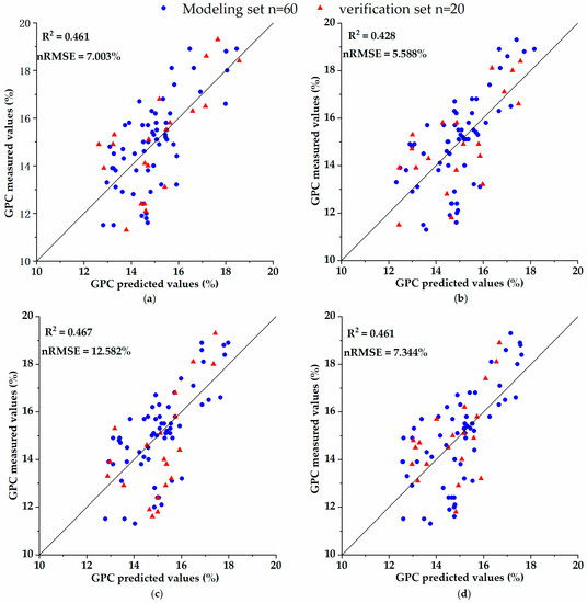 Considering the correlation between spectral parameters and wheat GPC listed in Table 9, the wheat GPC estimation models were constructed based on the four wheat nitrogen parameters (PNA, PNC, LNA, and LNC) and spectral VIs. The models are shown in Table 9. The correlations between the measured and predicted GPC values for the four models are shown in Figure 8.
