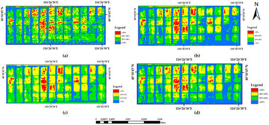 Remote sensing has been widely used as a non-destructive approach for estimating the leaf N content in the past few decades [21,22,23,24]. Leaf N accumulation (LNA) can provide comprehensive information about leaf dry matter and LNC, thus reflecting leaf N status, as well as vegetation coverage during crop growth [25]. Meanwhile, plant N concentration (PNC) and accumulation (PNA) have also been used as indicators for assessing the plant N status for crops [26]. PNC, expressed on a land area basis, is the product of the plant N concentration and dry biomass. It can be used to indicate the N status of crops in the same growth stage [27]. PNA is highly variable within a single year and between years, sites, and crops, even when the N supplies from both the soil and additional fertilizer inputs are plentiful [28].