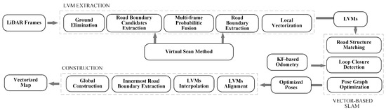 In this paper, all essential components of the automatic road boundary mapping are presented. They comprise the extraction of the local vectorized road boundary map (LVM extraction), the vector-based SLAM and the construction of the global vector map (LVM fusion). The LiDAR frames are captured by using a vehicle-mounted multibeam LiDAR sensor, that is, the velodyne HDL-64. The whole pipeline is presented in Figure 1 and will be described in detail in the following sections.