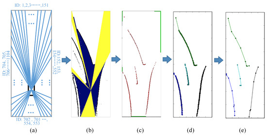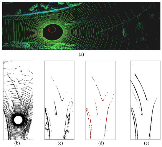 In the next step, the virtual scan method [40] is applied to eliminate obstacles unrelated to the road boundary for improving accuracy and efficiency (Figure 2d). However, the extracted road boundary in one frame is sparse and can be incomplete; therefore, it should be further densified by the multiframe probabilistic fusion.