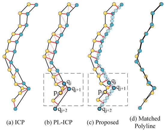 Figure 5a illustrates the node-to-node-based distance metric used in ICP, in which the distances between nodes do not reflect the correct distances between two polylines. Figure 5b illustrates the node-to-line-based distance metric adopted in PL-ICP. PL-ICP searches the nearest end nodes pair in the reference polyline of a node in the target polyline (as shown by the dashed red lines) to approximate the node-to-line correspondences (as shown by the solid red lines). However, erroneous correspondence is created for node because the line segment formed by the nearest end nodes pair of , , is not the nearest line segment of , which should instead be line segment . This is especially common in our case because the nodes in a simplified polyline are sparse.