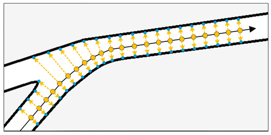 The illustration of the extraction of the innermost road boundary point by probe-based sampling, where the yellow nodes represent the trajectory of the vehicle and the blue nodes represent the sampled road boundary.