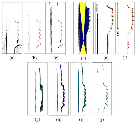 Figure 9g–j demonstrates the results of matching. The results of ICP (based on projected point clouds) and our method (vector-based matching of LVMs) are compared. In Figure 9g, the original 10 frames for matching are shown. The matching result with ICP is shown in Figure 9h, where misalignments are easily visible as “thick” point clouds. The matching with raw-LVMs and simplified-LVMs with the proposed matching method are shown in Figure 9i,j, respectively. Both results are superior to ICP and the latter obtains the best results with the points that are all overlapped (Figure 9j).