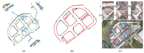 Figure 13a shows the aligned global road boundary points and the extracted innermost points. Figure 13b is the result of vector-based mapping. Detailed examples can be found in Figure 13c. In Figure 13c-I, the asphalt road merged to the road under construction (shown as the light gray area); therefore, no separating boundary can be mapped. The same case can be found in Figure 13c-VI. In Figure 13c-II, all the road boundaries, even the narrow pedestrian path, are mapped. In Figure 13c-III, IV and V, zigzag boundaries are present on the road corners. This result is due to the alignment errors in some corners, as seen by thick yellow points in blue boxes in Figure 13a. The reason could be the multiple reflections from glass and uncorrected matching errors.