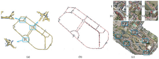 Based on the optimized trajectory, all the LVMs are aligned to construct the global vector map. In Figure 11a, the yellow points represent the extracted innermost road boundary points by the probe-based sampling method. Figure 11b shows the reconstructed global vector map from the innermost road boundary points. To intuitively exhibit the mapping result, the vector map is overlaid on the aerial image of the mapped area (Figure 11c). This result shows that the vectorized map retains the structure of the road boundary in a vectorized form, which aligns well with the actual road boundary. Figure 11c-I, II, and VI show successfully mapped intersections; all the road boundaries along the trajectory are mapped except for those far away from the trajectory. Figure 11c-I presents an intersection nearby an overbridge, and the ground road boundary is mapped. In Figure 11c-III, the road boundary near an entrance of a building is shown. Since the entrance is not separated from the road by curbs, the mapped road boundary extended to the layout of the building. Figure 11c-IV shows a complex intersection with multiple lanes and vegetated areas. The mapped road boundary twisted slightly on the border of the vegetation on the left. The cause is the uneven distribution of the vegetation. Figure 11c-V shows a roundabout along the road, and the boundary along the trajectory is mapped correctly.