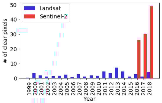 Average number of clear pixels for the study site Lena Delta for the summer periods covering 1999–2018 (blue bars: Landsat; red bars: Sentinel-2).