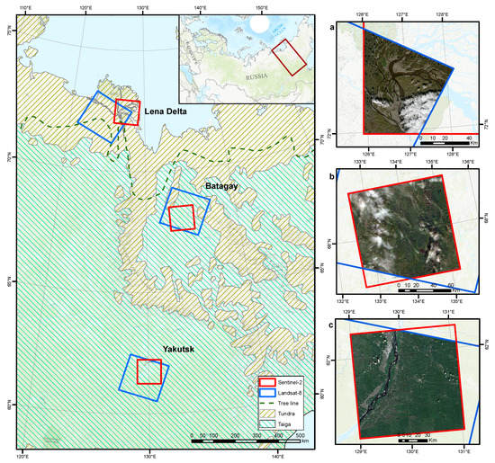 The three Arctic-to-Boreal study sites, Lena Delta, Batagay region, and Yakutsk region, are located along an approximate north-south transect in Eastern Siberia. The blue frames show the Landsat-8 image footprint, and the red frames show the Sentinel-2 image footprint of the same-day acquisitions used in this study. Sentinel-2 RGB composites of the overlapping area for the Lena Delta (a), Batagay region (b), and Yakutsk region (c).