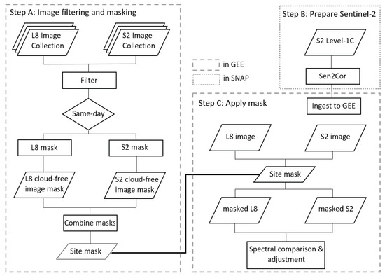 The data processing workflow consisted of three steps (Figure 3). In Step A, we filtered and cloud-masked the imagery. In Step B, we processed Sentinel-2 surface reflectance images with the Sentinel Application Platform. In Step C, we masked the Landsat-8 and Sentinel-2 images to prepare the pixel-by-pixel data input for the spectral comparison and adjustment.