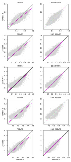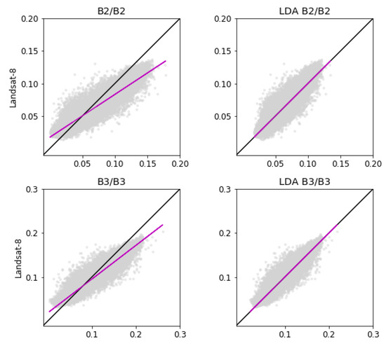Comparison of surface reflectance values from the Sentinel-2 and Landsat-8 corresponding bands for the Lena Delta. Left plots: observed surface reflectance values. Right plots: Lena Delta Adjusted (LDA) Sentinel-2 reflectance values. The solid black line is one-to-one, and the pink line is the ordinary least squares regression trend line. In all plots, the Sentinel-2 values and bands are on the x-axis, while Landsat-8 is depicted on the y-axis.