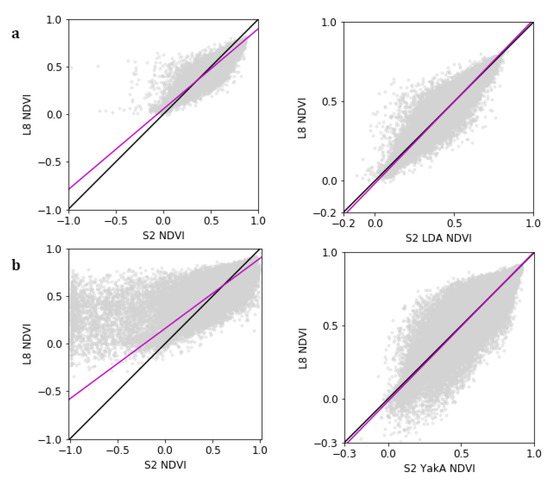 Comparison of NDVI values from the Lena Delta ((a), upper row) and Yakutsk ((b), lower row). Left plots: NDVI calculated from observed Landsat-8 and Sentinel-2 surface reflectance values. Right plots: NDVI calculated from adjusted Sentinel-2 and observed Landsat-8 reflectance values. The solid black line is one-to-one, and the pink line is the ordinary least squares regression trend line.