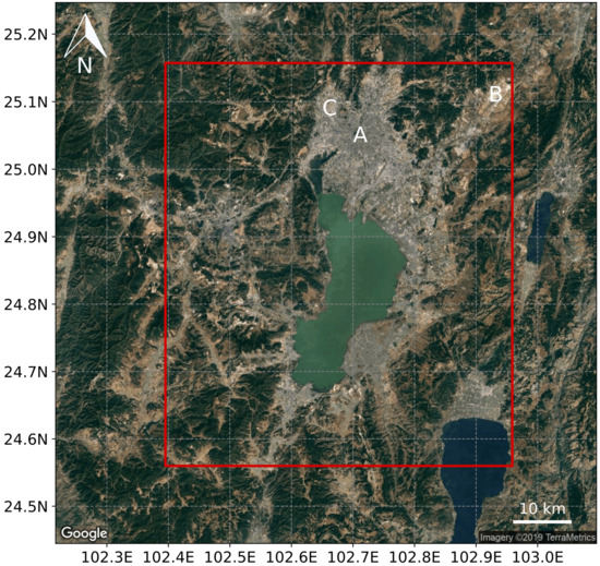 Larger Kunming area, with the Local Climate Zone (LCZ) region of interest in red. A, B, and C are respectively the centre, airport, and high-tech industrial development zone, respectively. Figure produced with [45].