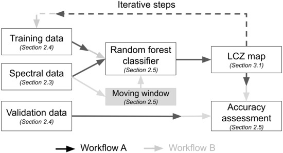 Overview of LCZ classification. Workflow A is default World Urban Database and Access Portal Tool (WUDAPT) protocol, while Workflow B is the modified workflow that uses a moving window to include neighbourhood information. Redesigned after Figure 3 in Reference [34]. Section numbers indicated in the boxes provide full overview of what is done in each step. Note that this procedure was repeated for years 2005, 2011, and 2017.