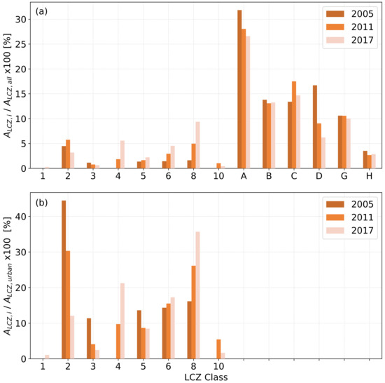 LCZ histograms for all years presenting the corresponding surface area (A) of each LCZ (A) as the percentage of (a) the total surface area (A) and (b) the total urban area ().