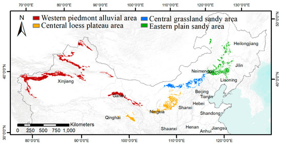 The water–wind crisscross erosion area in China. It consists of four regions from west to east: the western piedmont alluvial area, the central Loess Plateau area, the central grassland sandy area, and the eastern plain sandy area.