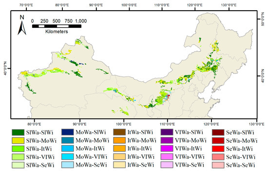 The soil erosion status map in 1995 was used as a baseline in this study (Figure 2, Table S1). This satellite-based soil erosion product was developed in the second National Soil Erosion Investigation of China (NSEI-C) using field surveys and visual interpretation jointly by the Ministry of Water Resources (MWR) of the People’s Republic of China and the Chinese Academy of Sciences (CAS). The soil erosion intensity was classified into six levels: slight, light, moderate, intensive, very intensive, and severe. The intensity of water–wind erosion was named by the levels of water erosion intensity and then followed by the levels of wind erosion intensity. We extracted the soil erosion status in 1995 for the water–wind crisscross erosion regions.