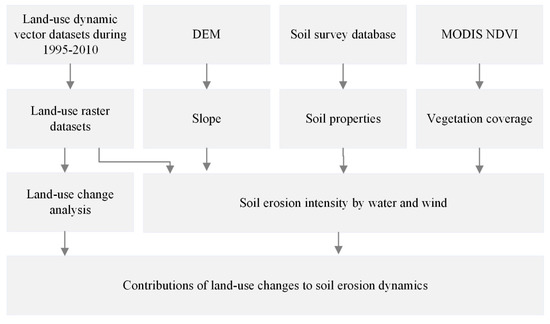 Soil erosion can be classified as water, wind, and freeze-thaw erosions, according to the formation mechanisms [6]. Water and wind erosions are driven by energy from rainfall and wind [5]. The potential of soil erosion is also determined by the topographic complexity, soil properties, land use, and management practices [7,8]. Land-use change, a critical component of global change, regulates the effects of human activities on the conservation of soil and water resources. With increasing demands for food and settlements, natural vegetation (e.g., forest and natural grasslands) has been replaced by agricultural land and artificial surfaces, inducing expansion of soil erosion and reduction of soil resources [1,9]. Land use or management changes, such as increasing crop and grazing intensities, do not transfer the land cover types but potentially lead to soil property degradation with increasing erosion hazards [1].