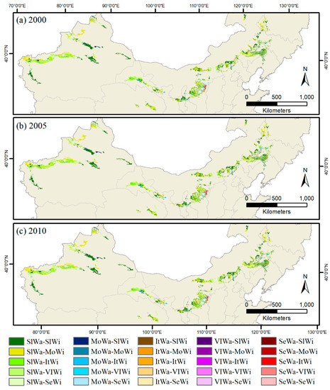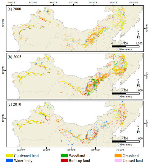 The distribution of land uses over the water–wind crisscross erosion area of China in (a) 2000, (b) 2005, and (c) 2010. Only the regions with land-use change during each period of 1995–2000, 2000–2005, and 2005–2010 were shown in these figures. The area of each land-use type is shown in Table S3. The differences in land-use change between 2000, 2005, and 2010 were shown in Figure S1.