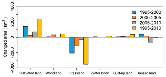 From 1995 to 2010, about 13,893.16 km2 of area has experienced land-use change including the first-level and second-level land-use types (Figure 4). From the first period of 1995–2000 to 2000–2005 and 2005–2010, the changing area dropped continuously, from about 6683.94 km2 to 5202.28 km2 and then 2006.94 km2. During the 15 years, grasslands had the largest changes in the area, with a decrease of 3350.74 km2 (Figure 5). It is followed by the increases of cultivated lands, woodlands, built-up lands, and water bodies. Unused land has the lowest net area change with a slight diminution of −56.6 km2. A conspicuous feature for this period is the consecutive decline of grasslands and steady increments of cultivated lands, albeit the changing amounts are reducing for both types from the end of the 1990s to the end of the 2000s (Figure 5).