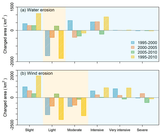 The net changed areas for each (a) water erosion and (b) wind erosion levels during for study periods of 1995–2000, 2000–2005, 2005–2010, and 1995–2010. The light blue and orange shadows present the decrease and increase trends of changed area for each intensity level during the three study periods.
