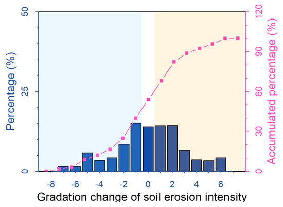 Percentage of each gradation change of water–wind combined erosion intensity across the water–wind crisscross erosion zone of China during 1995–2010. The accumulated percentage from gradation decrease to increase is shown in the purple line. The light blue and orange shadows highlight the intensity decrease and increase levels, respectively.