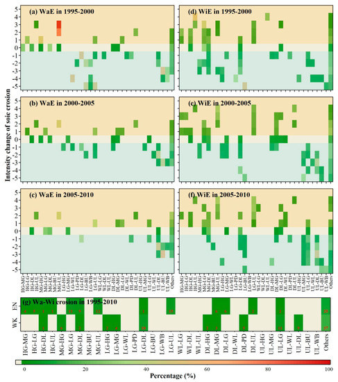 The contributions (noted by percentage) of each land-use transformation to every water (a–c) and wind (d–f) soil erosion intensity change during three periods. The light blue and orange shadows highlight the intensity decrease and increase levels, respectively. Figure 9g summarizes the contributions (the percentage was noted as red numbers) of each land-use transformation to the intensification and alleviation from water–wind combined soil erosion during 1995–2010. This figure shows the dominate land-use transformations, including high, moderate, and low coverage grasslands (HG, MG, LG), paddy (PD), drylands (DL), built-up lands (BU), unused lands of sandy lands, the Gobi Desert, bare soil (UL), woodlands (WL), and water body (WB).