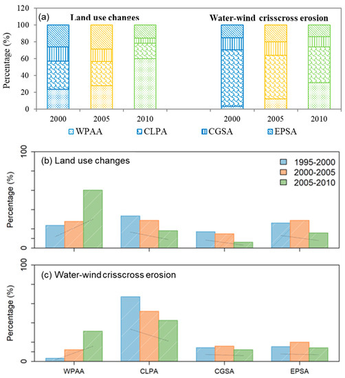 The (a) proportions and (b-c) trends of land-use changes and water–wind crisscross erosion across the four regions in the study area, including western piedmont alluvial area (WPAA), the central Loess Plateau area (CLPA), the central grassland sandy area (CGSA), and the eastern plain sandy area (EPSA).