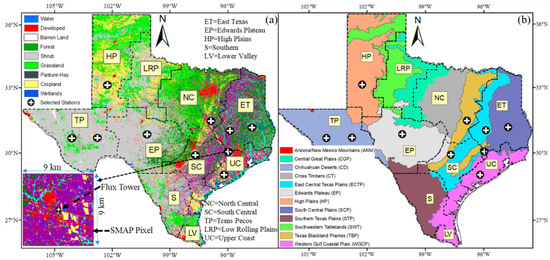 (a) Climate zones and their corresponding land-use, and (b) ecological regions and climate zones in the study area. White crosses are the locations of ten select Soil Moisture Active Passive (SMAP) grids. The inset figure (9 km × 9 km, not in scale) is a selected SMAP grid, covering Prairie View A&M University (PVAMU) research farm, to evaluate SMAP Gross Primary Productivity (GPP) and Net Ecosystem Exchange (NEE).