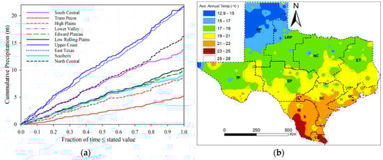 Cumulative distribution of precipitation (a), and average annual distribution of temperature across Texas (b) using precipitation and temperature data from 2001–2018. The cumulative precipitation plot for each climate zone was developed using National Climatic Data Center (NCDC) daily precipitation data, whereas the annual average temperature (calculated using NCDC daily temperature data) was used to develop the spatial average temperature map across Texas. The x-axis of the cumulative distribution of the precipitation plot includes a fraction of time, which means 0.5 represents 50% of the time (9 years for this plot), and 1.0 represents 100% of the time (18 years for this plot).