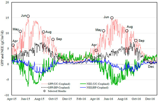 Daily gross primary productivity (GPP) and NEE at Upper Coast (UC) and High Plains (HP) for cropland during 2015 and 2016 to select the critical month of each year to develop spatial distribution maps. A sequence of time series plots was developed to identify the sensitive months when GPP and NEE values were changing or abruptly changed during the study period. Based on the changes in seasonal distributions of GPP and NEE, six different months (Apr, May, Jun, Aug, Sep, and Dec) of 2015 and 2018 were used to develop spatial distribution maps of GPP and NEE.