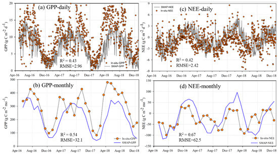 Daily and monthly SMAP and in-situ GPP and NEE at PVAMU Research Farm (2016–2018). The unit of RMSE is the same as of GPP and NEE.