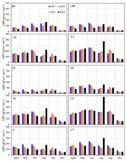 Forestland of ET and TP climate zones had different GPP distributions during the study period. The observed GPP in ET climate zone was low to high (51–100 g C m−2 mo−1 (December) to >400 g C m−2 mo−1 (August)), whereas it was low (<50 g C m−2 mo−1 (December)) to average (101–150 g C m−2 mo−1 (August)) in the TP climate zone during the study period. On the other hand, GPP decreased from August to September in 2015 and 2018 at both climate zones. The pasture-dominated region of ET and NC climate zones showed an increasing trend from April to June and decreasing trend from August to December. However, ET climate zone had higher GPP than NC climate zone (Figure 7).