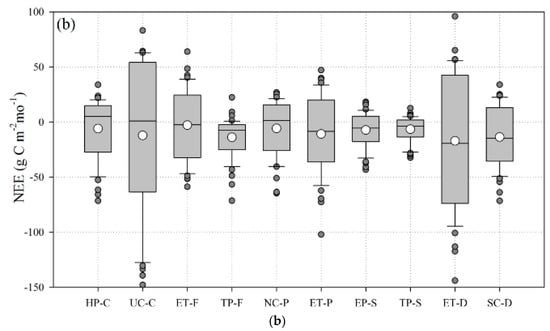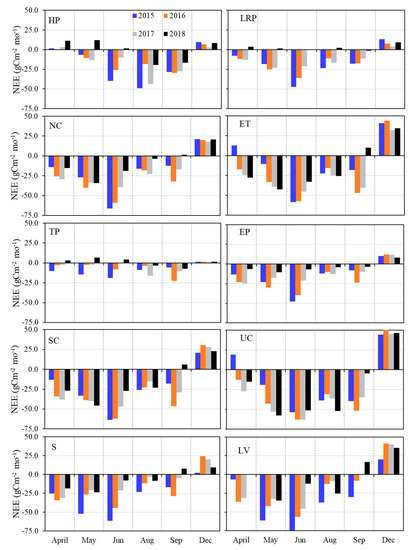 Forestland of ET and TP zones had significantly different NEE each month except August and September. For example, ET and TP climate zones had carbon emissions and carbon uptakes, respectively, in April 2015, which were reversed in April 2018. In December, TP climate zone had low carbon emission, whereas ET climate zone had high carbon emission. Pastureland of ET and NC climate zones showed similar NEE distributions each month, except September and December. Pastureland of ET climate zone had high carbon emission, whereas the NC climate zone had low carbon emission in December each year. However, ET and NC climate zones had low carbon emission and low carbon uptake, respectively, in September 2018, whereas both climate zones had similar NEE distributions in September 2015.