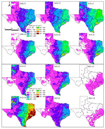 Spatial distribution of GPP across Texas for selected months of 2015 and 2018. White crosses are the location of selected SMAP grids.