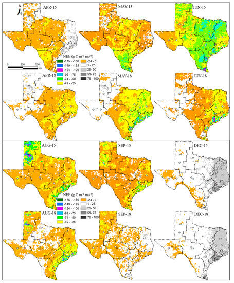 Figure 7 and Figure 8 compare the spatial distribution of monthly GPP and NEE between 2015 and 2018 in all climate zones. In addition, Table 2 compares the change in spatial coverage of specified NEE and GPP ranges between selected months of 2018 and 2015 across Texas. Based on the estimated GPP range during the study period, this study assumed monthly GPP values >301, 100 to 300, and <100 g C m−2 mo−1, respectively, as a high, an average, and a low GPP. Similarly, NEE values >75, 25 to 75, and <0–25 g C m−2 mo−1, respectively, assumed to be high, average, and low carbon emissions, whereas NEE values <−75, −25 to −5, and >−25 and <0, g C m−2 mo−1, respectively, assumed to be high, average, and low carbon uptakes during the study period. These classifications will help to compare GPP and NEE values at a different location across Texas. To interpret the changes between 2015 and 2018, the GPP and NEE values were grouped into nine and eleven classes, respectively (Table 2). All of the positive values indicate 2018 had higher spatial coverage for particular NEE and GPP ranges than 2015, whereas all of the negative values indicate 2015 had higher spatial coverage for particular NEE and GPP ranges than 2018.