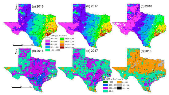 Annual distribution of GPP (a–c) and NEE (d–f) across Texas. White crosses are the location of selected SMAP grids.