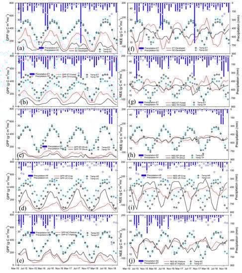 The temporal distribution of monthly GPP and NEE of each land-use category in one climate zone was compared with the distribution of monthly GPP and NEE of the same type of land-use in another climate zone. Time series plots of monthly precipitation, temperature, GPP, and NEE were developed across all ten locations to understand the temporal variations of these parameters for ten ecosystems during the study period (Figure 10). Graphs of each land-use in two different climate zones showed monthly and seasonal variations of precipitation, temperature, GPP, and NEE (Figure 10). Monthly GPP and NEE values were plotted to observe variations in the rate of carbon production and CO2 exchange during the study period for each land-use.