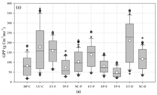 Shrubland of EP climate zone showed higher GPP than shrubland of TP climate zone. However, both locations dominated by shrubland in these climate zones had similar seasonal variations in GPP (Figure 10c). These shrublands also had the highest GPP during the summer and lowest during the winter (Figure 10c). Both EP and TP climate zones had the highest GPP, respectively, 145 and 44 g C m−2 mo−1 in June 2015. Each summer, as compared to other seasons, these climate zones received slightly higher precipitation during the study period. However, the EP climate zone received slightly more precipitation than the TP climate zone. The R2 values and p-values (0.95 to 0.68 and <0.0001 to 0.0010), for GPP for shrubland in EP and TP climate zones showed very good correlations each year except in 2017, when R2 value and p-value were 0.44 and 0.0188, respectively (Table 4). Figure 11a shows a higher median and mean and larger range of GPP values in EP climate zone than TP climate zone.