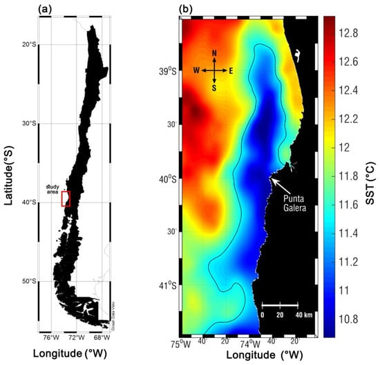 Southeastern Pacific along continental Chile (a) and the study area (red box) off central-southern Chile (b), which includes sea surface temperature (SST, color, °C) from 21st October, 2013, which represents coastal upwelling in austral spring.